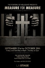 [Originally written for LA Splash.] Hosting another bold production of the Bard, The Porters of Hellsgate Theatre Company is currently staging Shakespeare‘s problematic comedy, otherwise known as one of his ‘broken’ dramas, Measure for Measure. The literal cautionary tale begins with two young lovers prosecuted for their acts of love and resulting child out of wedlock, which presents itself as a wicked moral dilemma for Angelo (Justin Michael Terry), left to mind the town in the Duke’s absence. But instead of traveling, Duke Vincentio (played with shrewdness and perfect diction by director Thomas Bigley) is parading as a pious Friar Lodowick to see if Angelo is corrupted by his new found power. When the chaste and virtuous sister of the accused fornicator Claudio (Matt Calloway), Isabella, meets Angelo to plea for her brother’s life, he strikes an unfair bargain, bartering her pledge of innocence for her brother’s. Claudio is scheduled to be executed if Isabella doesn’t abide, but she dies inside knowing she’d break her vow. Angelo is not blind to the irony of calling lustful acts criminal while seeking to steal the virginity of devoted damsel under duress. How will the watchful Duke decide to confront Angelo?