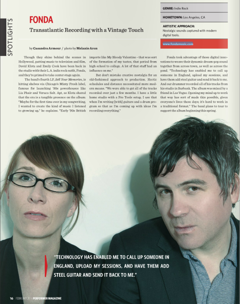 Though they shine behind the scenes in Hollywood, putting music to television and film, David Klotz and Emily Cook have been back in the studio with their L.A. indie rock outfit, Fonda, and they’re primed to take center stage again.