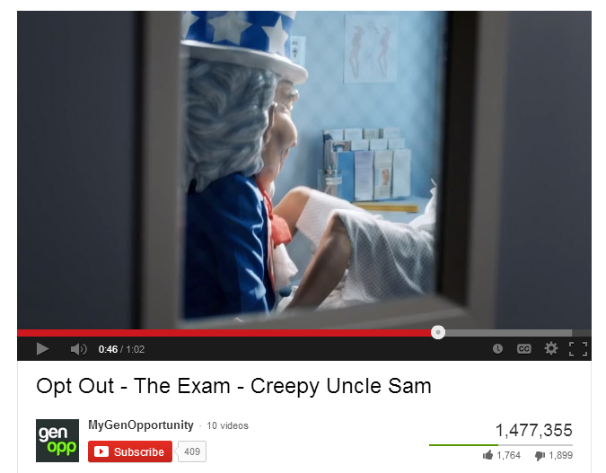 Posted by the “edgy” political group Generation Opportunity, the project is titled “Opt Out- The Exam- Creepy Uncle Sam”. Creepy? I don’t think creepy begins to cover it when an eerie-grinned freak wields a speculum at a naked woman with her feet in stirrups. Imagine how conservatives would shudder and shriek at the “gayness” of it if liberals launched an ad with a leering, jubilant Uncle Sam giving a prostate exam to a nude man for shits and giggles. But these vagina-obsessed GOP perverts find it a-ok to put a woman in a perilous situation to prove a point. (Oh wait, watch the surprising follow-up, The Glove, where this time Uncle Same does actually dish out anal penetration to an unsuspecting young man. Hilarious!)